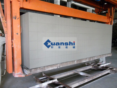 1、將澆注養(yǎng)護后的坯體帶?蚝蛡(cè)板凌空吊起,翻轉(zhuǎn)90度(坯體已直立),吊放至切割臺進行開模、脫模。吊去?,坯體即能切割。