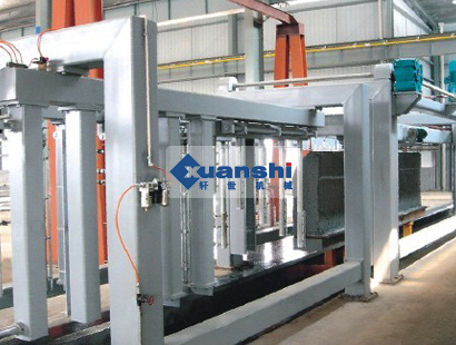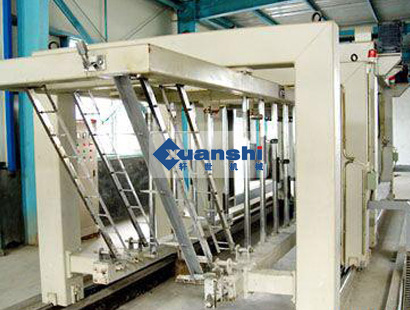 (2)坯體行走:預(yù)養(yǎng)好的坯體帶?罩蟹D(zhuǎn)90度,然后將坯體放在切割小車(chē)上或輥道上,由脫模機(jī)構(gòu)脫去?。坯體通過(guò)小車(chē)或輥道行走進(jìn)行水平切割,切割好后坯體繼續(xù)前行至橫切位置定位,進(jìn)行橫向切割,切割好后前行由行車(chē)吊走坯體。