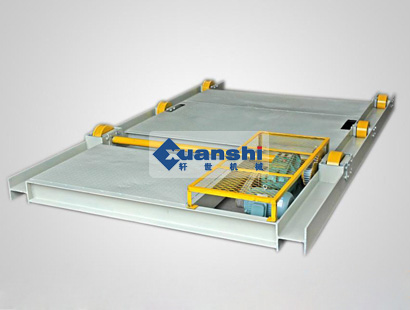 擺渡車是各類蒸養(yǎng)制品廠成型工段連接蒸養(yǎng)工段換向拖動(dòng)不可少的設(shè)備.該車具有拖動(dòng)、頂推強(qiáng)勁有力的特點(diǎn).大車橫向快速移動(dòng)后能夠準(zhǔn)確的停止、定位和接軌,大車載重運(yùn)行時(shí)可變頻慢速運(yùn)行,空車回程時(shí)可變頻快速。擺渡車上還設(shè)有縱向動(dòng)力裝置,可以拖動(dòng)、頂推滿載3噸制品的蒸養(yǎng)小車20輛。