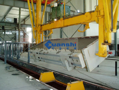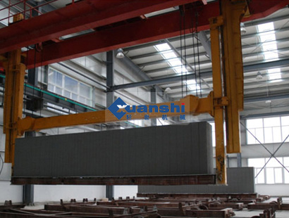 翻轉(zhuǎn)吊具是加氣混凝土生產(chǎn)設(shè)備中主要配套設(shè)備,翻轉(zhuǎn)吊具將坯體(帶模具和側(cè)板)在空中翻轉(zhuǎn)90度,吊放在切割臺(tái)或切割小車上,脫去模框,坯體即能切割。
