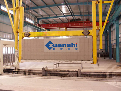 1、將澆注養(yǎng)護(hù)后的坯體帶模框和側(cè)板凌空吊起,翻轉(zhuǎn)90度(坯體已直立),吊放至切割臺(tái)進(jìn)行開模、脫模。吊去模框,坯體即能切割。