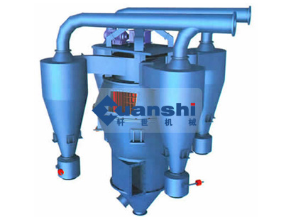該機由調速傳動部分、主軸轉子部分、分級圈、旋風筒、滴流裝置、殼體、風機等組成,物料由進料口落到撒料盤上,在離心力作用下沿徑向甩出而分散于選粉室內與旋轉上升氣流相遇,與分級圈一起高速旋轉,使氣流中的物料受到較強離心力作用,通過分級圈的細粉經旋風筒收集落入集灰斗,由下部細粉口排出,粗粉落到滴流裝置,從粗粉口排出。