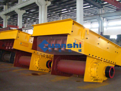 該機采用雙偏心軸激振器的結構特點,保證設備能承受大塊物料下落的沖擊, 給料能力大。在生產(chǎn)流程中可以把塊狀、顆粒狀物料從貯料倉中均勻、定時、連續(xù)地給到受料裝置中去,從而防止受料裝置因進料不均而產(chǎn)生死機的現(xiàn)象,延長了設備使用壽命。給料機可分為鋼板結構和篦條結構,鋼板結構的給料機多用于砂石生產(chǎn)線,將物料全部均勻地送入破碎設備;篦條結構的給料機可對物料進行粗篩分使系統(tǒng)在配制上更經(jīng)濟合理,在破碎篩分中已作為必不可少的設備。